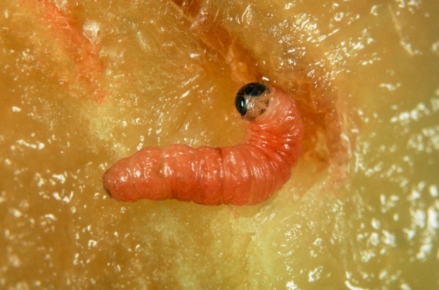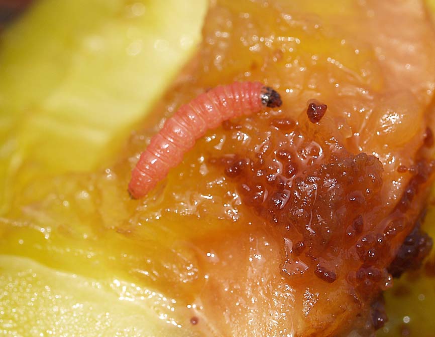 Larvele consumă întregul fruct şi chiar sâmburele. Dezvoltate complet larvele se retrag în crăpăturile scoarţei pomilor. Aici se transformă în pupe, construindu-şi un cocon din fire de mătase.