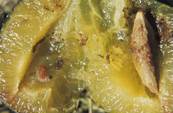 Larva pătrunde în fructe, săpând o galerie spre peduncul. Fructul nu mai creşte şi cade înainte de a se matura.